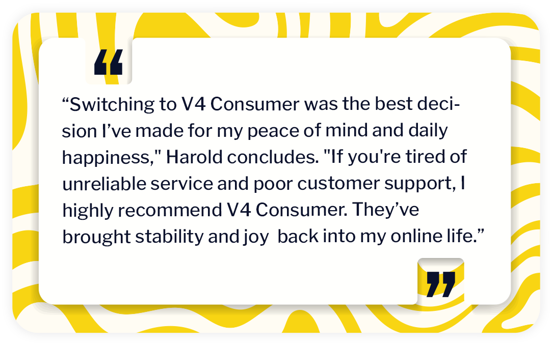 Determined to find a better option, Harold began researching alternative broadband providers. He read countless reviews and sought recommendations from friends and neighbours. It was during this search that he discovered V4 Consumer. "I read so many positive reviews from people who were in similar situations to mine," he says. "They all praised V4 for their reliability and excellent customer service."